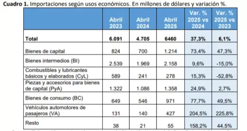 “La combinación de apertura comercial con apreciación cambiaria impulsó el incremento de las importaciones, que en abril de este año crecieron un 37,3% interanual”, destacaron desde el centro económico que coordina Claudio Lozano. Si bien todos los usos de las importaciones registraron subas en el último año, el que más se elevó fue “Vehículos automotores de pasajeros” (+204,5%), seguido de “Resto” (+158,2%), un componente con un peso menor que adquirió impulso debido a la mayor compra de bienes despachados mediante servicios postales o couriers. Le siguió el incremento en la importación de Bienes de Consumo (+77,7%)